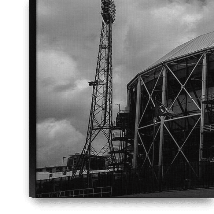 Feijenoord stadium De Kuip in a black-and-white Panorama. Dark rain clouds pile up around this iconic stadium in Rotterdam.