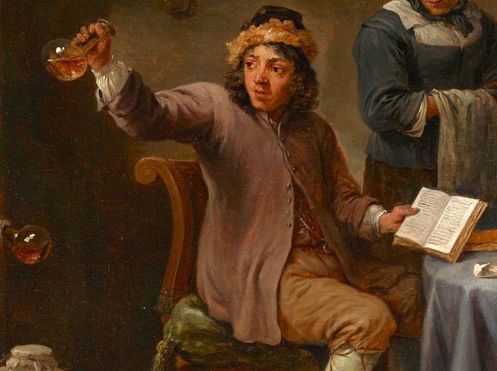 The Consultation leads us into the chamber of a dispenser, with overtones of an alchemical laboratory. The artist treats the poorly appointed surroundings (perceived as mysterious and esoteric by the characters) with gentle indulgence and good humoured irony in the representation of the elaborate procedures and paper work necessary for a simple urine test. The clarity of the artistic means and intention of the painter finds its perfect embodiment in the recreation of the tension of the moment. The patient, an ignorant woman, is waiting for the verdict of the dispenser, in unwitting contraposition to the apprentice hidden behind the half-open door, while the ambers in the fireplace spread a mysterious glow. The entire scene is treated in various tones of grey and in harmonies of beige. The woman in blue makes a figure apart within the compositional and chromatic structure of the painting and, evidently, she was introduced by Teniers to provide a contrast to her odd surroundings