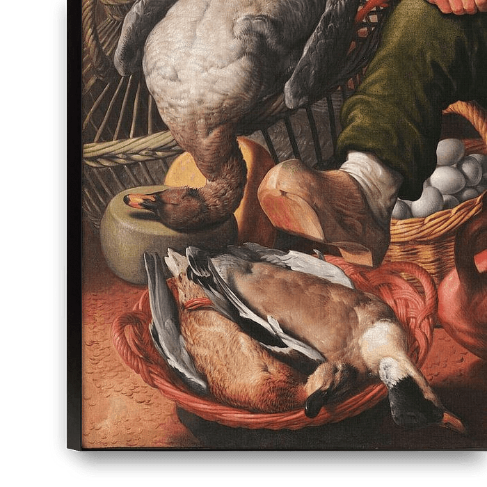 Unlike many of Beuckelaer’s market scenes, this painting includes neither an impressive cityscape nor a biblical episode. The subject is purely vernacular. The men are folkloric, whereas the women are pretty, dignified, and respectfully dressed. The man in front props his foot on a basket and touches the breast of the woman beside him. He glances at us as if he knows he is being judged.