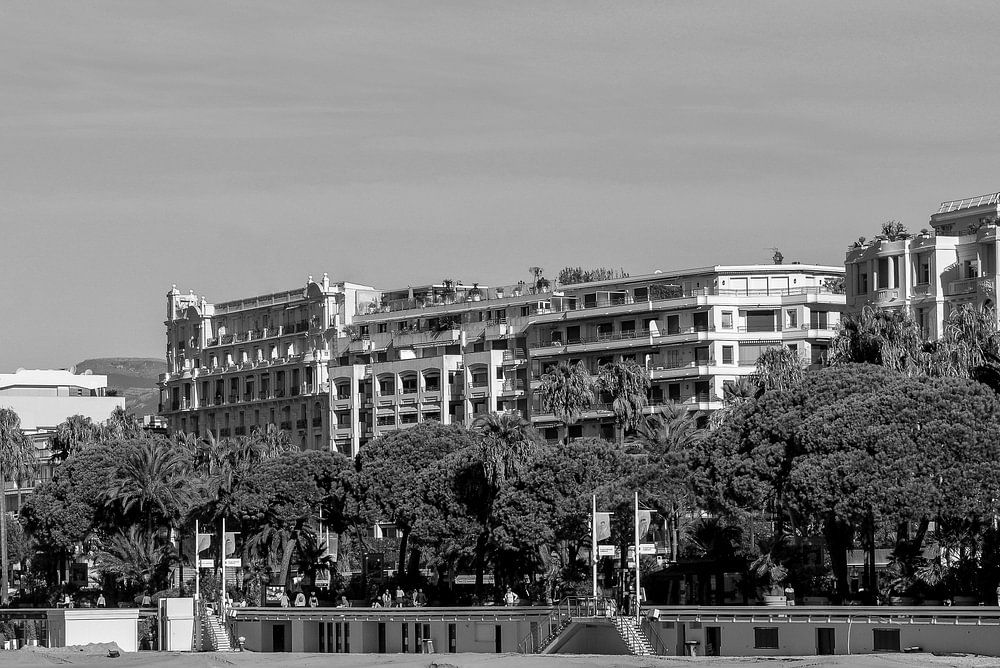 The Croisette in Cannes, French Riviera with the famous Carlton and Martinez hotels, in black and white by the photographer Tom Vandenhende from Saint-Tropez.