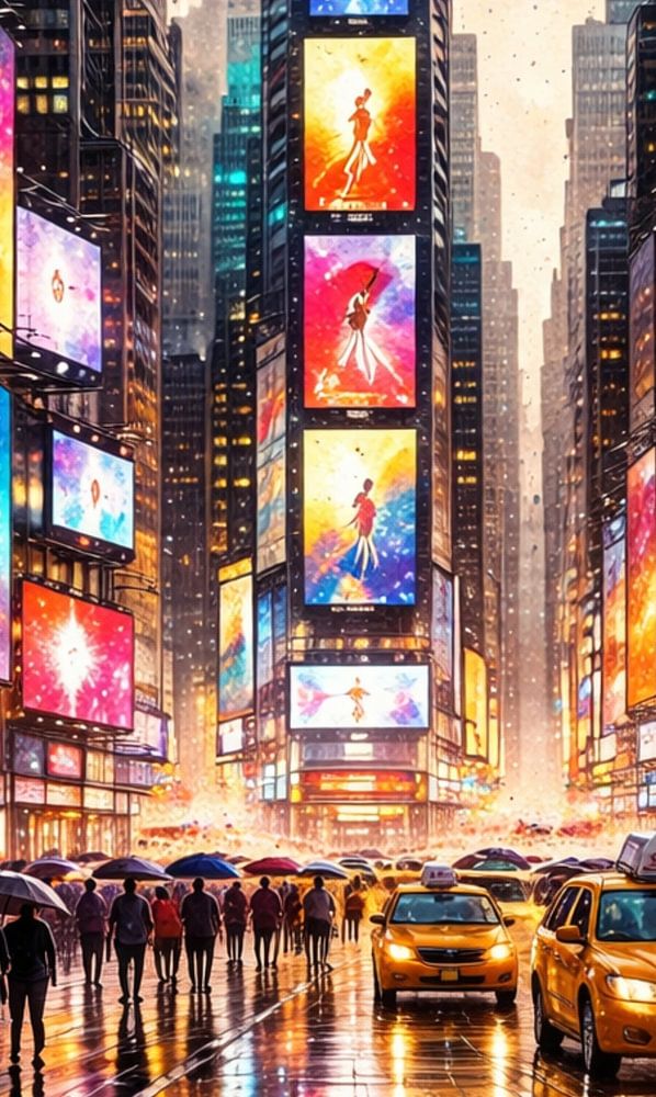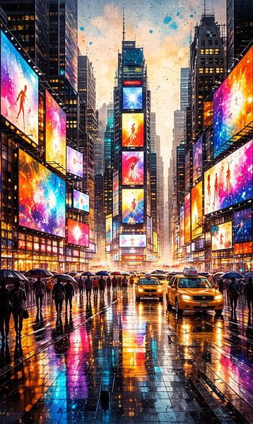 The Digital Heart of Times Square showcases the vibrant, futuristic metropolis of New York City, United States, which lights up in an explosion of colour, light and digital dynamism. The scene takes place on a rainy evening, transforming the wet streets into reflective surfaces…