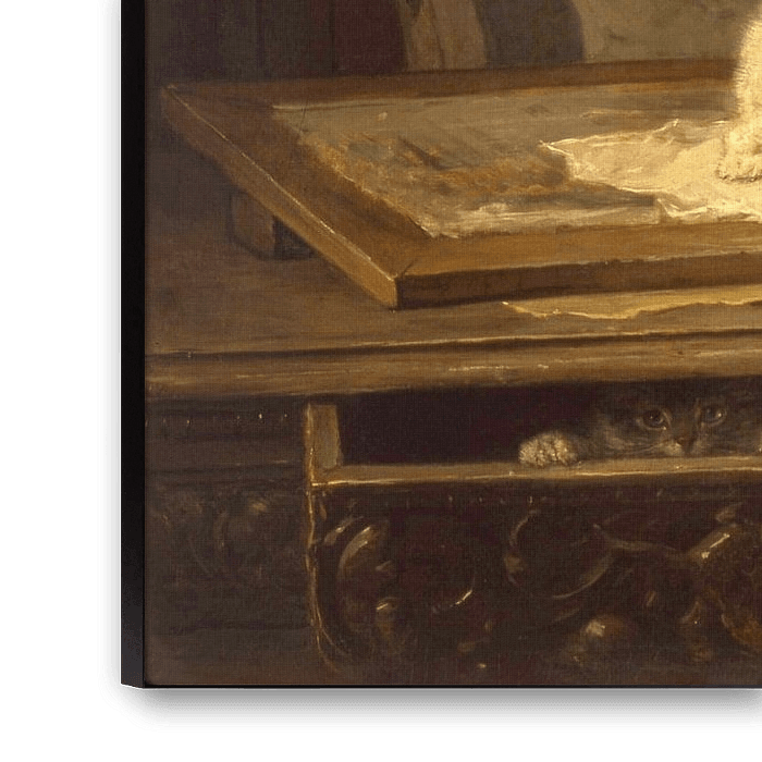 Henriette Ronner-Knip's painting "The Drawing Cats" is a famous work by this Dutch artist. Painted around 1870, it shows cats engaged in drawing a print. The cats are depicted with soft, flowing lines and bright colours, emphasising the beauty and playful nature of the animal. A loving and intimate portrait of cats engaged in a creative project, the painting conveys a sense of warmth and connection. It is a classic example of Ronner-Knip's work and her love for pets.