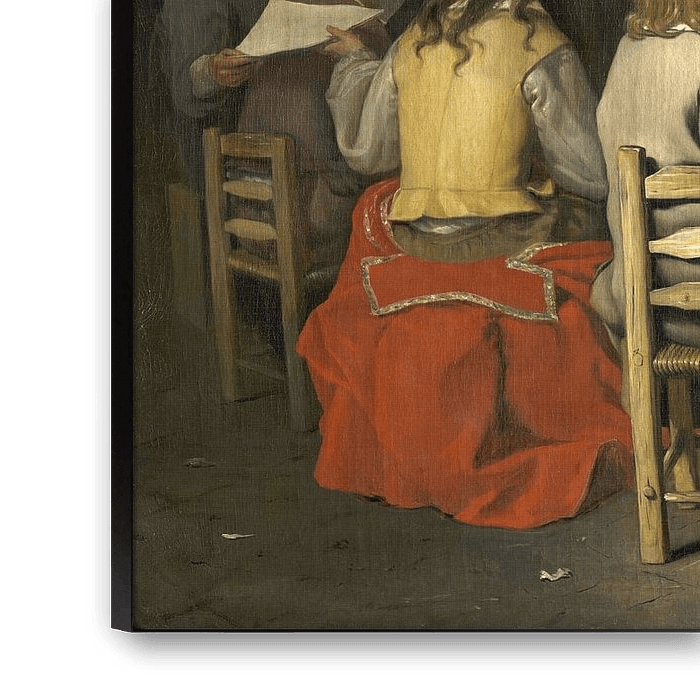 A seventeenth-century academy or artist’s studio: a teacher, seen from behind, gives a group of boys a drawing lesson. Between them, in the centre, stands a nude male model. In the past it was thought that this was the studio of Frans Hals and his pupils (among them some of his sons). However, there are no good arguments to support this interpretation.