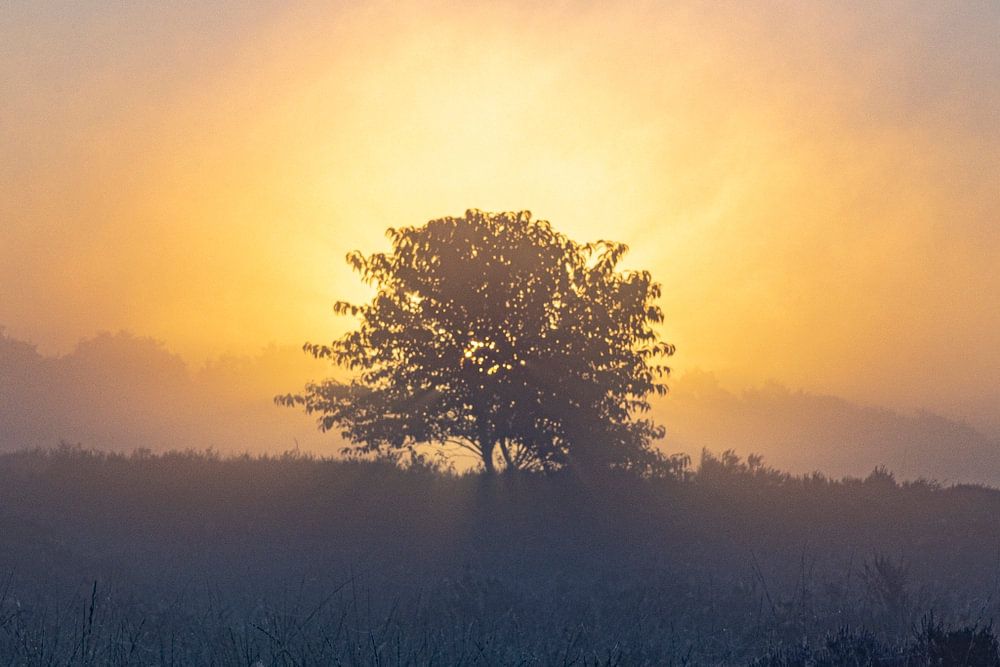 This picture was taken on one of the many moors in Drenthe, during a sunrise. Because of the strong cooling in the night, ground fog arises which dissolves (rises) as soon as the sun rises above the horizon. The photo was taken in August with day temperatures above 30C and night temperatures of 10-12C.