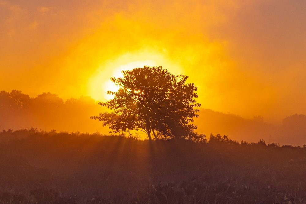 This picture was taken on one of the many moors in Drenthe, during a sunrise. Because of the strong cooling in the night, ground fog arises which dissolves (rises) as soon as the sun rises above the horizon. The photo was taken in August with day temperatures above 30C and night temperatures of 10-12C.
