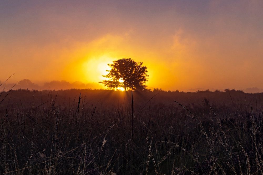This picture was taken on one of the many moors in Drenthe, during a sunrise. Because of the strong cooling in the night, ground fog arises which dissolves (rises) as soon as the sun rises above the horizon. The photo was taken in August with day temperatures above 30C and night temperatures of 10-12C.