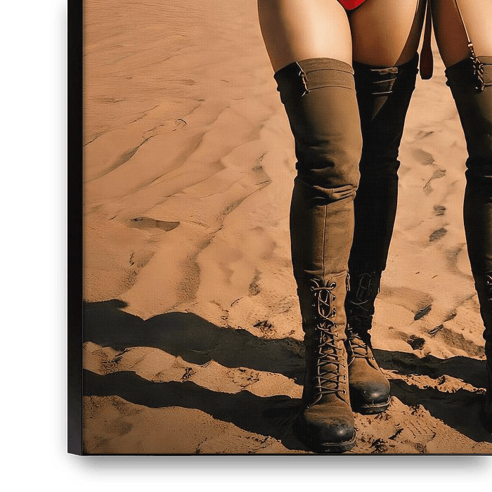 The Dunes Don't Care – Part 2 shows two women standing like modern icons in an endless dune landscape. The warm sand, harsh light and clear horizon line create an almost timeless stage. Their pose appears confident and calm – as if they command the silence of the desert as much as the moment itself. The scene is reminiscent of fashion…