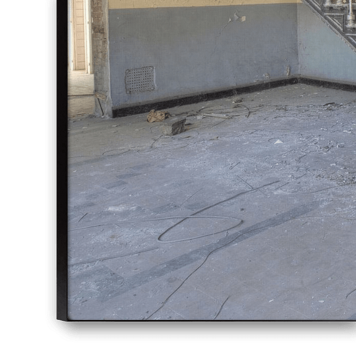 The lines of the hallway and staircase naturally draw the eye toward the brightly lit door at the end of the corridor. The contrast between decay and incoming light creates a symbolic image: despite the desolation, there is always hope, an opening, a way out. The structured ceiling, the geometrically patterned tiled floor, and the partly stripped doorways along the corridor all tell the story of a space that was once carefully designed and maintained.