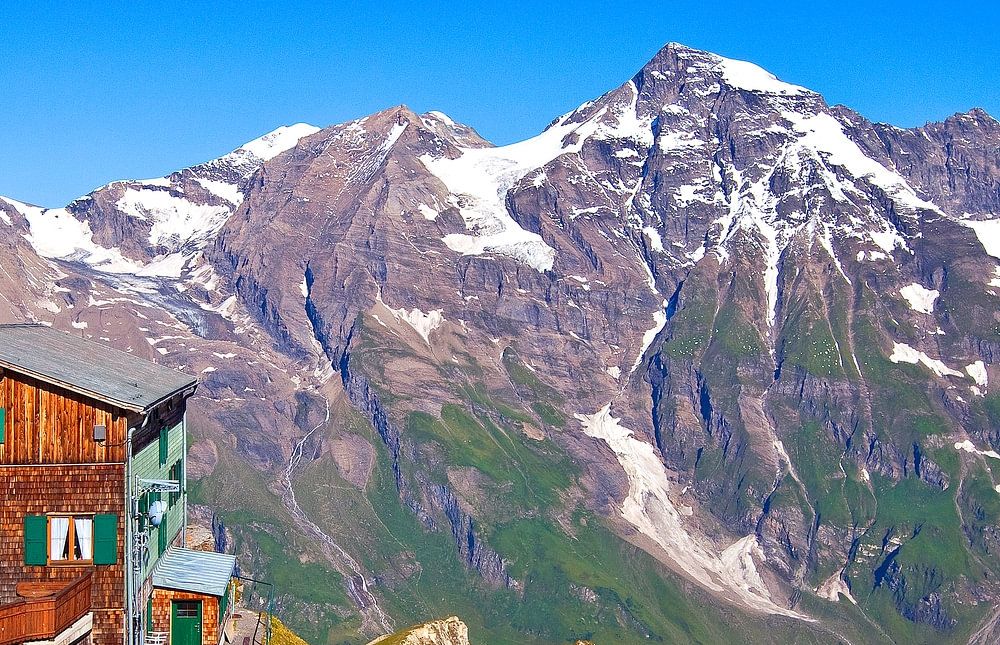 The Edelweißhütte against the backdrop of the Hohe Tauern with the Hohe Dock and the Großer Wiesbachhorn