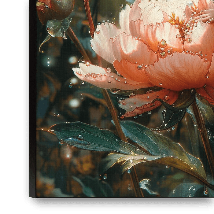 Above one of the peonies, a fairy with elegant wings shimmering in the light bends down. The elf has…