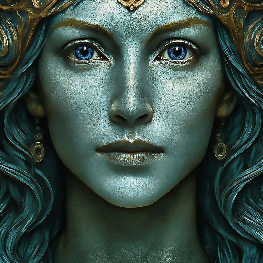 The Emerald Princess depicts a regal female figure that appears to rise from a world of ornate emerald and gold. Her stern, penetrating gaze is enhanced by the sheen of metallic skin tones and a richly detailed crown that grows out of the background like an organic pattern. The harmony between geometric precision and flowing…