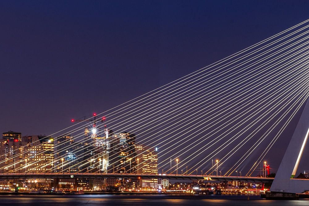 From the Kop van Zuid in Rotterdam, you can take very nice photo's. In the background the Swan (Erasmus Bridge), as it is called. and the skyline of Rotterdam The photo was taken during the blue hour.