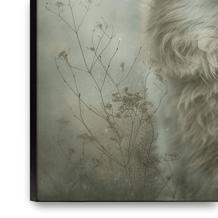 "Step into a world of timeless charm and warm affection. In this beautiful work, characterised by a vintage aesthetic, the majestic Pyrenean Mountain Dog, with its imposing stature and gentle eyes, radiates an aura of eternal wisdom. The painting uniquely captures the character and faithful dog of this noble companion, with loving…