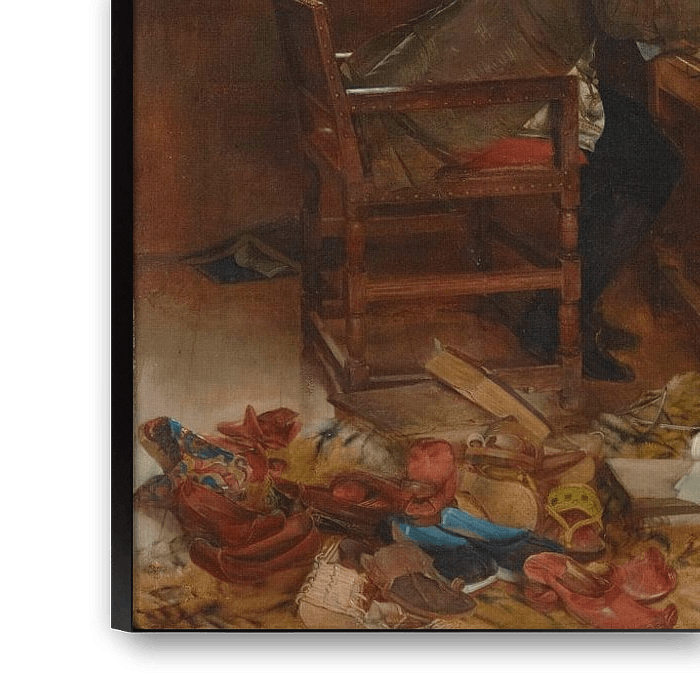 Following extensive travel in Asia, Francis Millet painted this ambitious work. A couple in historical dress occupy a room filled with exotic souvenirs—Indonesian puppets, Javanese dolls, Japanese books, and other curiosities—that Millet based on his own collection. He also modeled the setting after the parlor of a sixteenth-century house where he had lived in England. Despite these autobiographical elements, the figures are dressed in eighteenth-century costume, and the mood of the work, with its soft natural light and exquisite still lifes, recalls seventeenth-century Dutch genre painting.