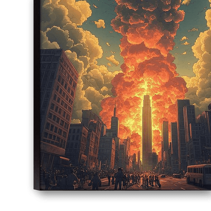 A lone car speeds down a desolate road as a massive explosion consumes the horizon. This cinematic masterpiece captures the raw intensity of destruction, juxtaposed with the eerie calm of a single vehicle’s journey through chaos. The fiery eruption illuminates the scene with breathtaking detail, evoking themes of resilience and the human instinct to escape against all odds. A visual narrative of adrenaline and despair wrapped in apocalyptic beauty.