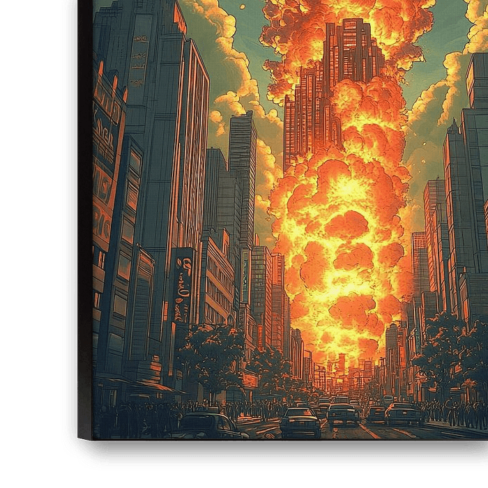 A lone car speeds down a desolate road as a massive explosion consumes the horizon. This cinematic masterpiece captures the raw intensity of destruction, juxtaposed with the eerie calm of a single vehicle’s journey through chaos. The fiery eruption illuminates the scene with breathtaking detail, evoking themes of resilience and the human instinct to escape against all odds. A visual narrative of adrenaline and despair wrapped in apocalyptic beauty.