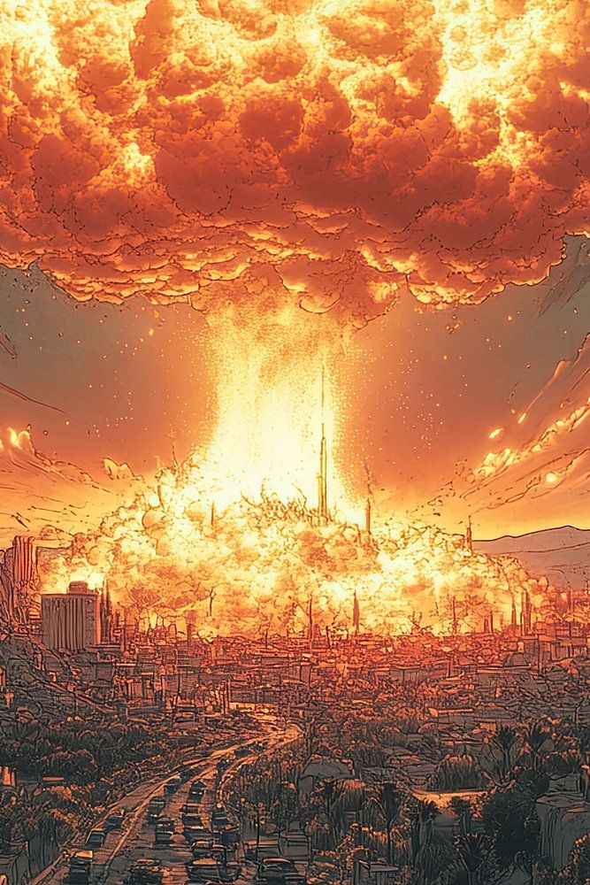 A lone car speeds down a desolate road as a massive explosion consumes the horizon. This cinematic masterpiece captures the raw intensity of destruction, juxtaposed with the eerie calm of a single vehicle’s journey through chaos. The fiery eruption illuminates the scene with breathtaking detail, evoking themes of resilience and the human instinct to escape against all odds. A visual narrative of adrenaline and despair wrapped in apocalyptic beauty.