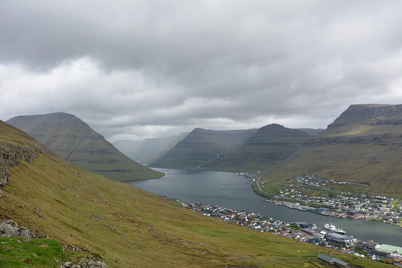 Experience the raw, atmospheric beauty of the Faroe Islands with this panoramic view of Klaksvík. Captured from Klakkur, this photograph looks down into the heart of the fjords, where the colorful coastal town nestles between towering, flat-topped mountains. The scene is defined by the unique, terraced geological layers of the islands…