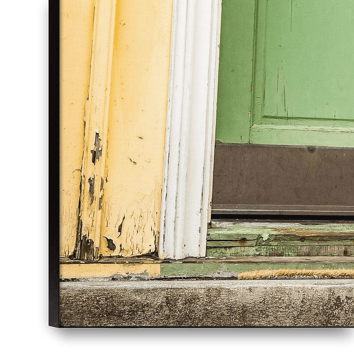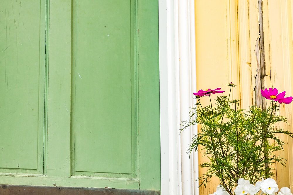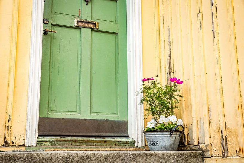 The entrance of an aged Icelandic wooden house appears in a quiet, reduced composition of soft pastel tones and clean lines. The green door, framed in white and set against an apricot facade, carries subtle traces of time and everyday life. On the step below, a simple metal bucket labeled “Garden” holds a few delicate flowers. In its…