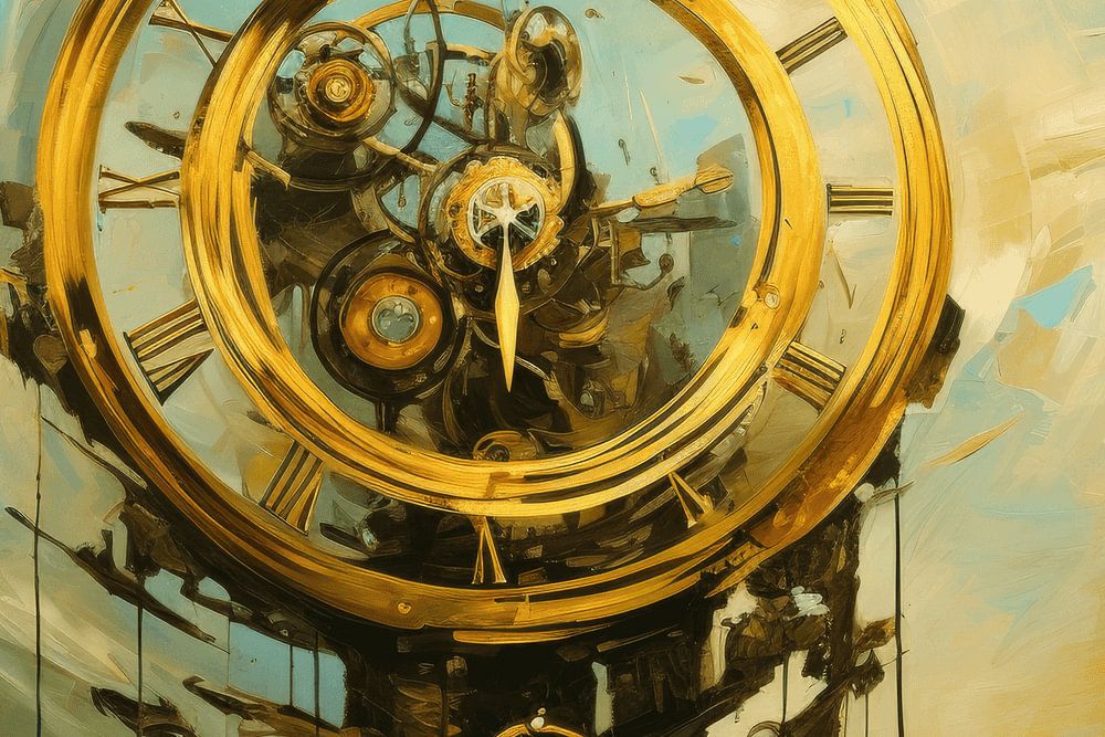 The golden clock stands stately and unchanging, a reminder of the constant nature of time, while the abstract background represents the unpredictability and relative nature of our perception of time.