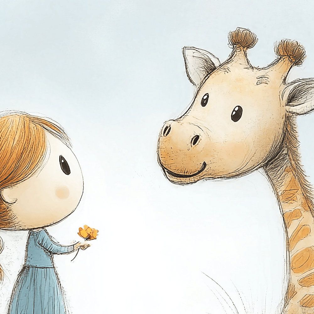 This enchanting illustration tells a beautiful story of a girl meeting a giraffe for the first time.