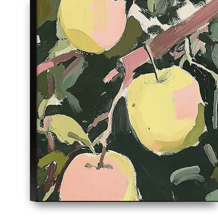 Close-up of an apple tree with pink and green leaves, an oil painting with thick brushstrokes. The branches are laden with pink apples, and the overall palette consists of pink, yellow and neutral tones. The composition is a wide shot that captures the entire scene.