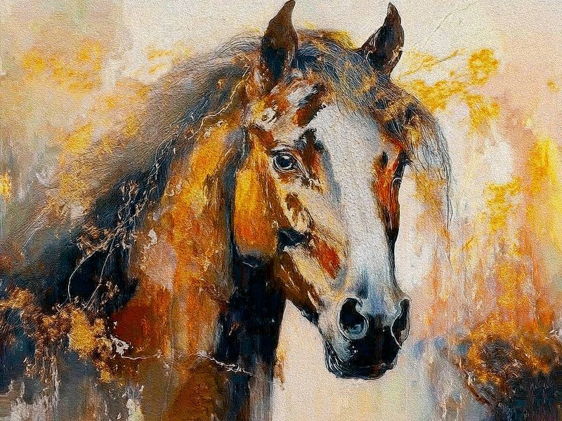 Buy this abstract artwork The Golden Horse by Marjolein Deelen on canvas, ArtFrame, poster and wallpaper, printed on demand in high quality.