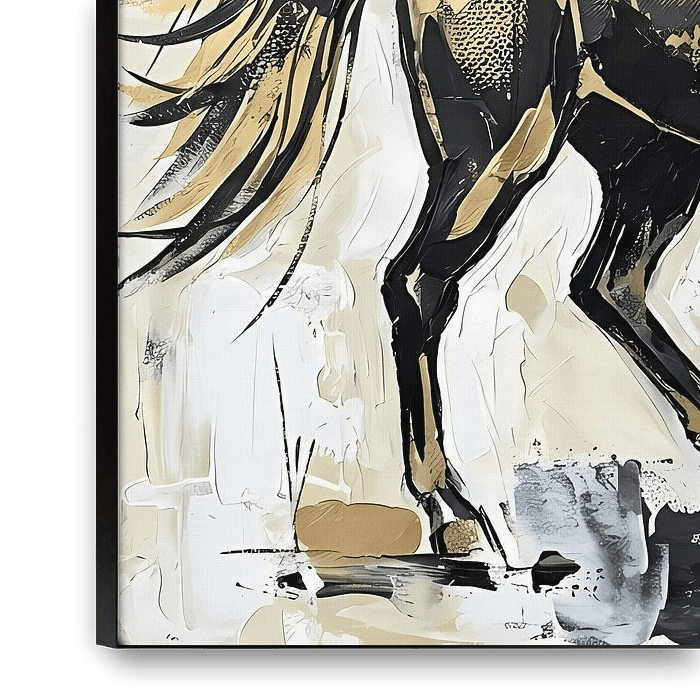 A dynamic, abstract artwork depicting the powerful silhouette of a unicorn in motion. Golden, black and beige accents create an energetic composition, whilst textured brushstrokes and geometric elements lend depth and expressiveness. The piece combines the magic of a mythical creature with modern artistic aesthetics, making it a…