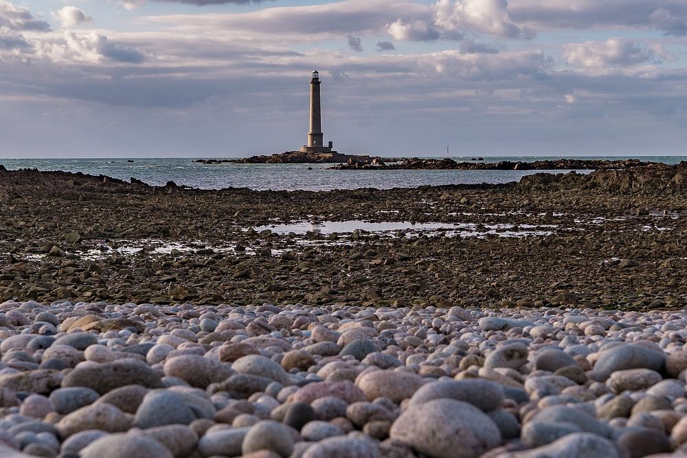 The Phare de Goury lighthouse in Normandy (Cap de la Hague) with a shingle beach in the foreground.