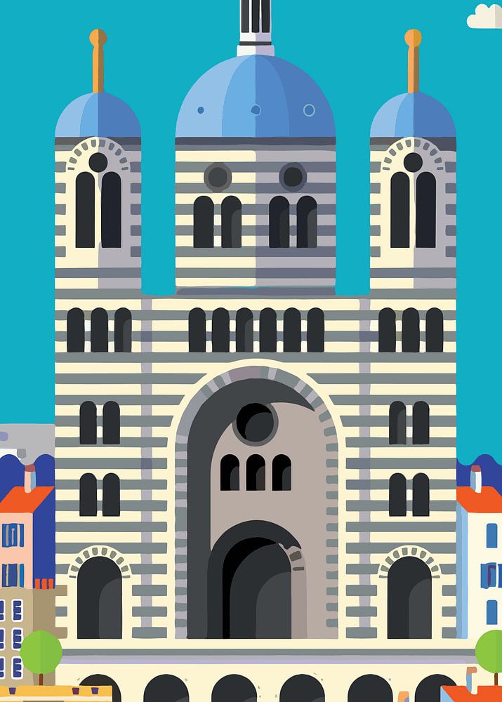 This bold illustration celebrates the Cathedral of La Major in Marseille, surrounded by charming old-town buildings and a sparkling blue sea. The striking architecture and lively urban landscape exhibit the city’s rich cultural tapestry and historic beauty.