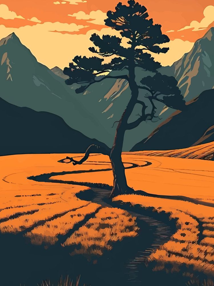 stylized landscape painting of a single, stout tree standing in a grassy field. A dirt path leads through the scene, with mountains and a warm, glowing sky providing a dramatic backdrop.