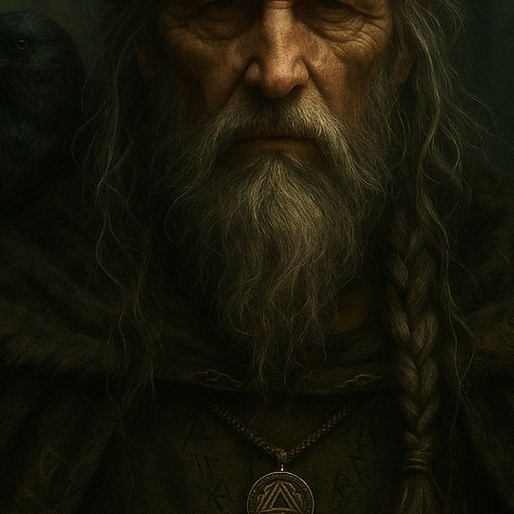 A mysterious, wise figure emerges from the shadows of an ancient forest. His weathered gaze, long grey hair, and striking spear suggest deep-rooted knowledge and strength. A raven perches on his shoulder while another circles in the background-messengers from another realm. His dressing gown is adorned with runes, and a pendant hints at forgotten wisdom. This piece draws inspiration from northern mythology and symbolism, without any explicit reference. The atmosphere is mystical, strong, and timeless-capturing a moment of silent power. In any interior, this artwork brings depth and intrigue. It's perfect for those drawn to mystery, nature, and spiritual energy. A powerful addition to your wall that lets the viewer imagine their own story behind the eyes of this ancient wanderer.