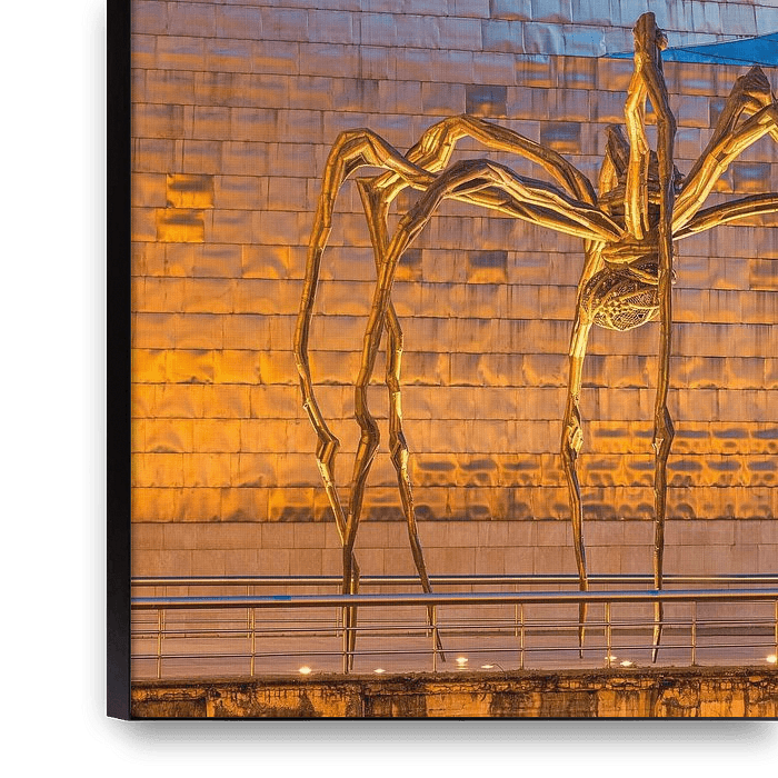 A photo with the large Spider standing in front of the famous Guggenheim Museum in the Spanish city of Bilbao with its distinct shapes and silver and gold shiny exterior during a sunrise on a summer morning.