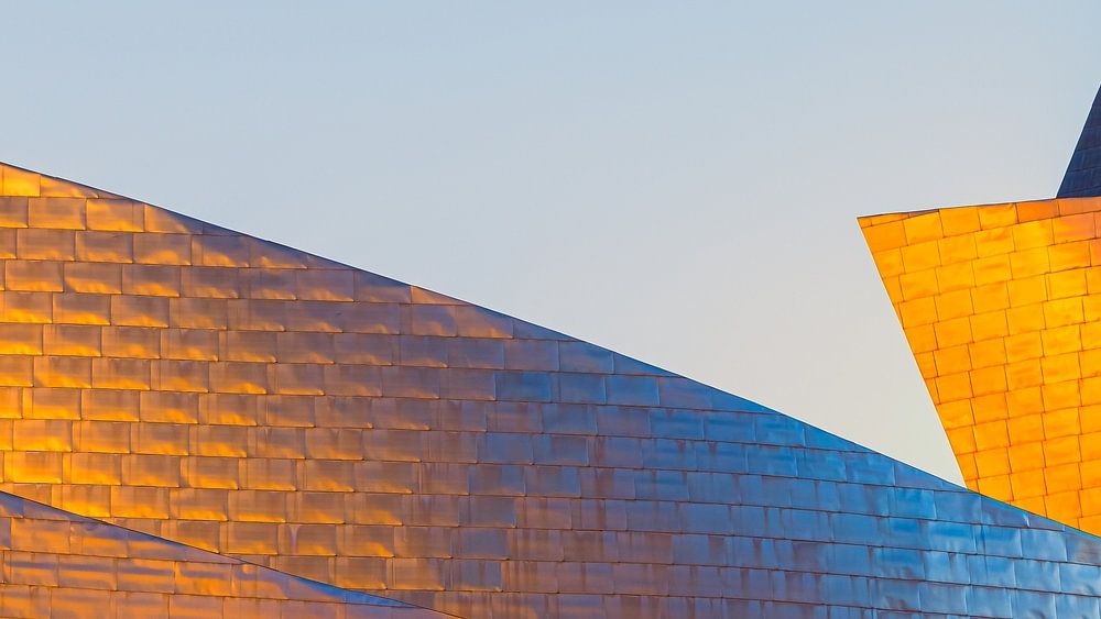 A 16:9 photo with close-up details of the famous Guggenheim Museum in the Spanish city of Bilbao with its distinct shapes and silver and gold shiny exterior during a sunset on a summer evening.