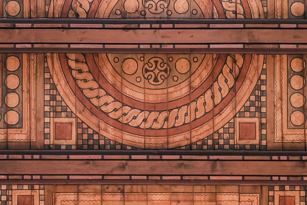 Like the old stave churches, which originated during Christianisation and therefore still contain many pagan symbols such as dragon heads and snake symbols, the Gustav Adolf church also has many such symbols. Notable are the many references to shipbuilding. For example, the Gustav Adolf stave church has a chandelier in the shape of a steering wheel and the upper windows resemble cabin windows. The stave churches from Norway, with around 50 seats, tend to be smaller and, due to the lack of large windows, very dark.