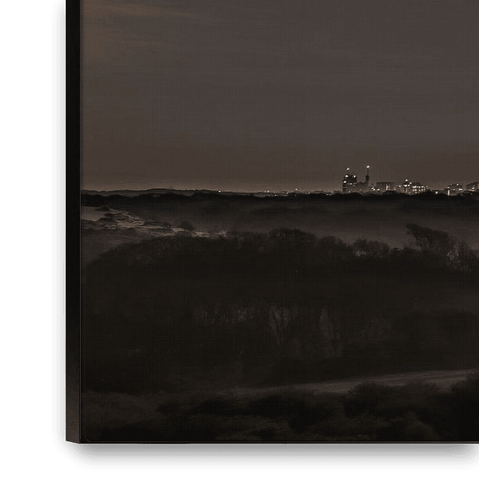 The Hague seen from Meijendel. The water basins of Dunea provide the morning fog. The moon illuminates the dunes in the foreground.