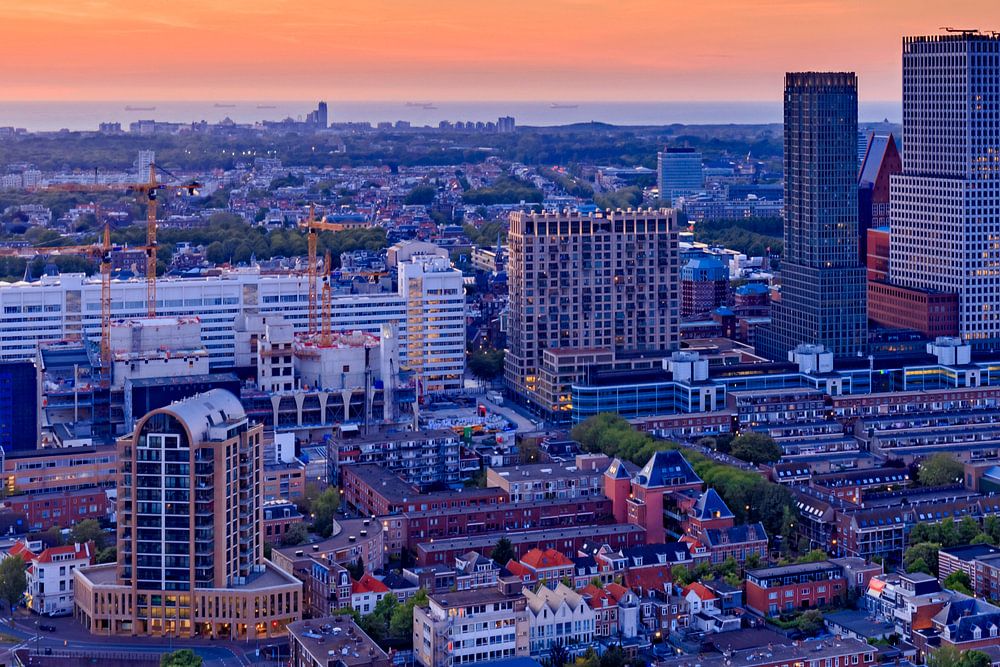 The Hague skyline shortly before sunset with, among others, the Ministry of Security and Justice, the Ministry of the Interior and Kingdom Relations, the Ministry of Housing, Spatial Planning and the Environment, The Hague City Hall, shopping centre and apartment complex New Babylon and The Hague Central Station.