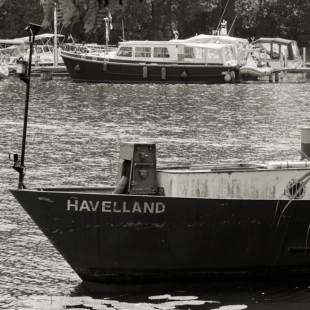 View from Eiswerderufer in Berlin Spandau on the river Havel with boats at a landing stage and an old disused barge in the foreground