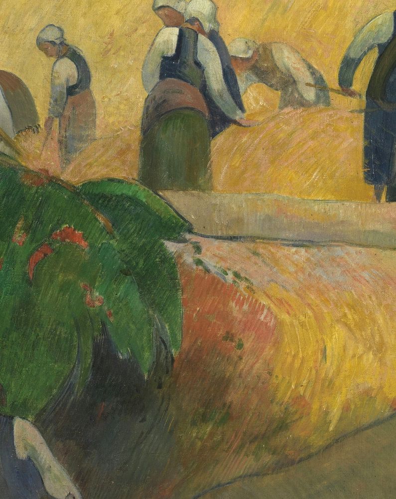 In the 1880s, Paul Gauguin made several extended trips to Brittany in western France, attracted by the region's remoteness and distinctive culture. This haymaking scene, captured during his third stay, is typical of the radically simplified approach he took to painting at this time. Forms are rendered as flat patches of vibrant colour, while three-dimensional relationships and perspective are deliberately ignored. Gauguin reduces the peasant women raking hay to the basic shapes of their black-and- white regional dress, presenting their actions as a timeless ritual.