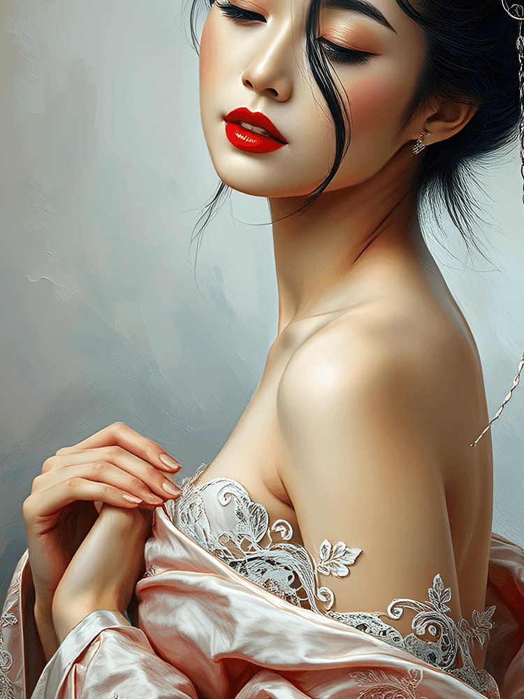 This artwork evokes a sense of fantasy and mystery, with rich colours and refined details reflecting rich Japanese culture. The geisha, with her serene expression and traditional accessories, invites you to explore her story and feel the depth of her emotion.