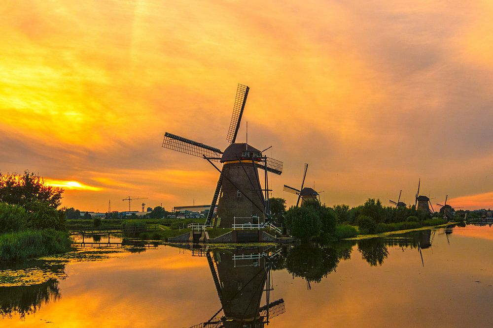 Kinderdijk ? The Kingdom of Windmills, is a beautiful landscape sunset, on a summer day in August with great reflections and colors .