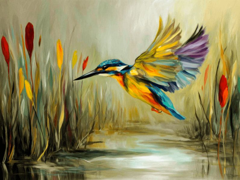 Buy this bird art The Kingfisher in Coloured Flight by Karina Brouwer on canvas, ArtFrame, poster and wallpaper, printed on demand in high quality.