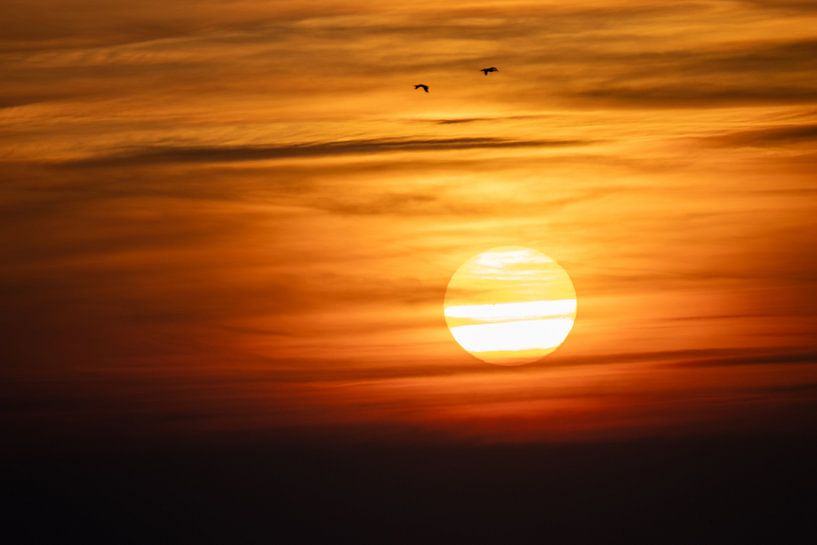 The sun slowly sinks into a sea of warm orange and gold tones. Thin wisps of cloud drift past the light like soft brushstrokes, while two birds glide high in the sky. The image exudes tranquillity and closure, a moment when the day quietly gives way to evening.