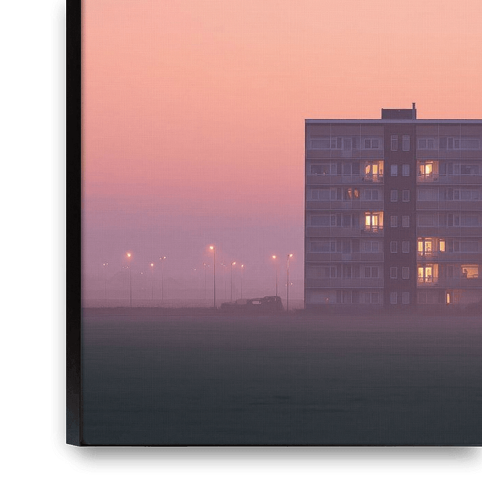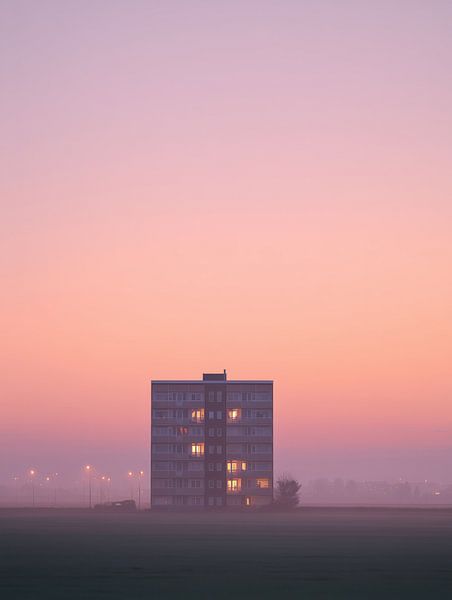 In the open polder landscape, a lone apartment building stands, detached from the city and surrounded by fog. The sky turns soft pink and peach, a silent transition between night and day. While the landscape is still asleep, light burns in some of the windows. Small signs of life, hidden behind concrete and glass. The contrast between…