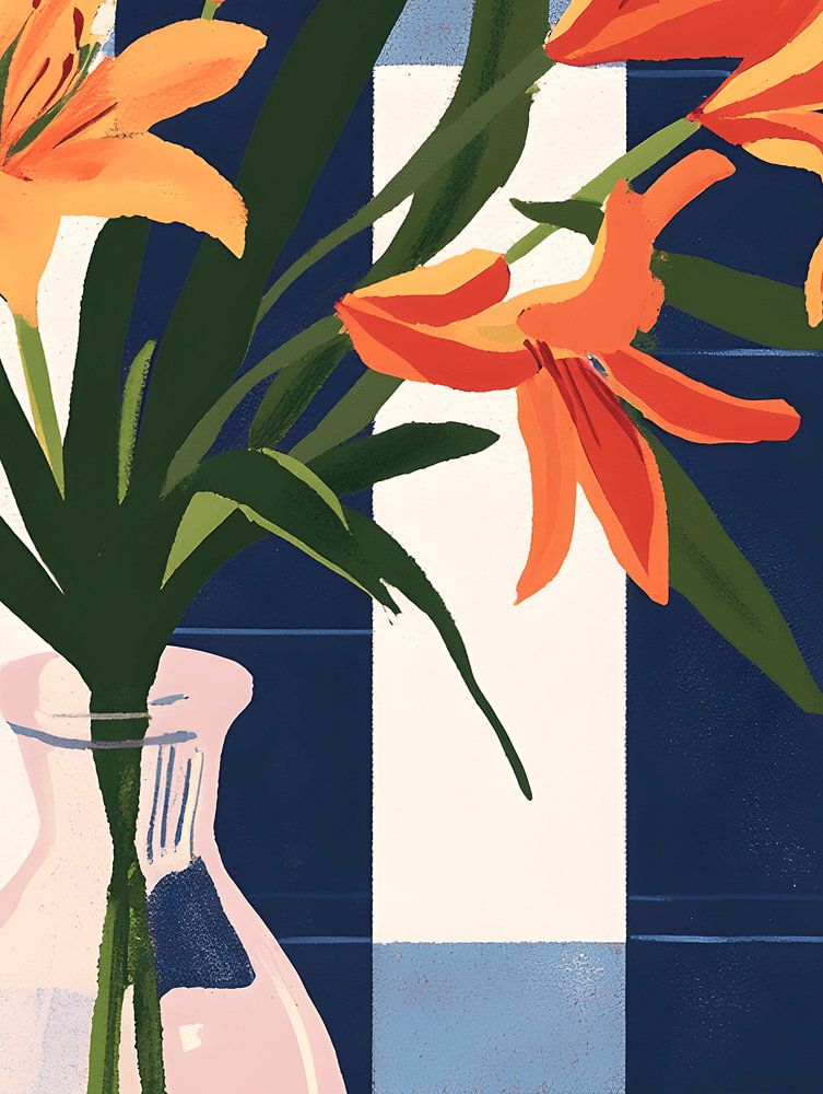 In dit kunstwerk worden de vurige oranje lelies tot leven gebracht met de expressieve flair van Matisse, waarbij de energie en vitaliteit van de bloemen op een moderne en abstracte manier worden vastgelegd. De lelies, in hun intense oranje tint, lijken bijna te pulseren met leven terwijl ze tegen een achtergrond van zachte, vloeiende vormen staan. De eenvoudige, maar krachtige lijnen en levendige kleuren geven het kunstwerk een speelse en toch elegante uitstraling, alsof de lelies hun eigen vrolijke dans uitvoeren.