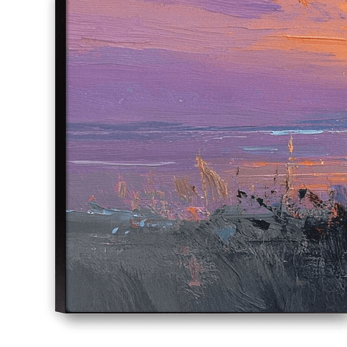 The soft brushstrokes and warm glow exude melancholy and tranquillity, ideal for 'modern landscape art' or 'orange purple interior decoration'. Suitable for living rooms, bedrooms or over a fireplace.