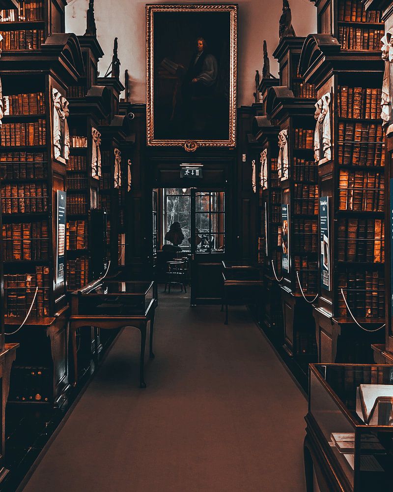 This symmetrical shot shows the central corridor of Marsh's Library in Dublin. Tall bookcases reach up to the vaulted ceiling, filled with thousands of historical books. The perspective draws the eye towards the painting at the end of the corridor, creating a monumental and almost museum-like feel.