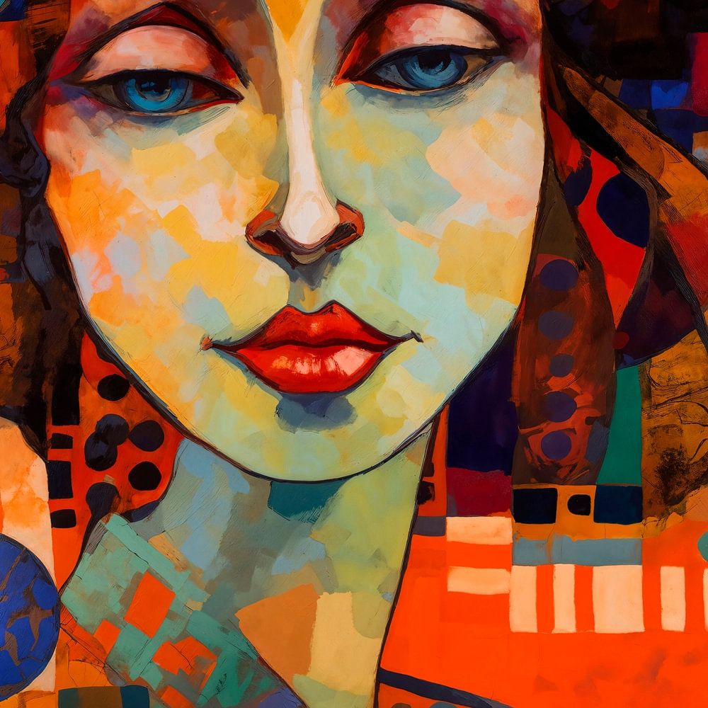 An abstract portrait of a woman with a striking pensive expression. The woman's face is characterised by a mosaic of colourful geometric patterns that blend seamlessly into the background. The background is filled with warm tones and a range of geometric shapes, creating a dynamic and layered composition.