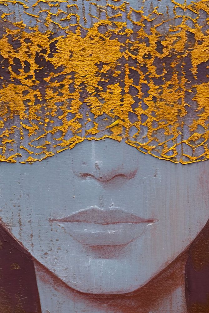 The Mask of Modernity - This women's painting shows a portrait of a woman wearing a striking golden mask, accentuated by the rust-brown and blue-grey tones that exude an industrial atmosphere.