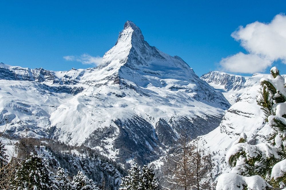 The Matterhorn in Valais, Switzerland on a crisp winter morning. The conifers in the foreground are covered with a thick layer of powder snow.